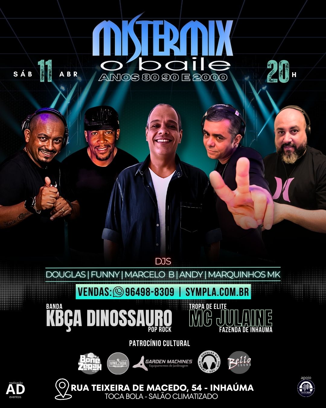 Bora comemorar a vida, encontrar os amigos e dançar muito ao som dos clássicos dos anos 80 e 90?! Data: Sábado, dia 11 de abril. Início: 20h Toca Bola - Rua Teixeira de Macedo, 54 - Inhaúma. (Salão Climatizado) VALORES DOS INGRESSOS: INGRESSOS AVULSOS 1º LOTE PROMOCIONAL ? R$ 10,00 + tx site Válido de 01 fevereiro a 15 de fevereiro 2º LOTE PROMOCIONAL ? R$ 15,00 + tx site Válido de 16 de fevereiro a 16 de março 3º LOTE ? R$ 20,00 + tx site Válido de 17 de março a 10 de abril MESAS LIMITADAS ? (4 LUGARES) 1º LOTE PROMOCIONAL ? R$ 50,00 + tx site Válido de 01 fevereiro a 15 de fevereiro 2º LOTE PROMOCIONAL ? R$ 60,00 + tx site Válido de 16 de fevereiro a 16 de março 3º LOTE ? R$ 80,00 + tx site Válido de 17 de março a 10 de abril Compre com desconto pelo PIX na Chave Celular (21) 96498-8309 (Anderson Cardoso Macedo - Pagseguro) Mais uma super edição do Mistermix - O Baile e o melhor dos anos 80, 90 e 2000. No Palco um super SHOW AO VIVO tocando muito Pop Rock Nacional e Internacional. Banda Kbça Dinossauro + MC Julaine da tropa de elite da Fazenda de Inhaúma. Incendiando a pista de dança tocando os clássicos dos anos 80 e 90: DJ Douglas DJ Andy DJ Marcelo B DJ Funny Music DJ Marquinhos MK Sorteios de muitos brindes Cervejas diversas, Drinks Sofisticados e um especial Cardápio de petiscos. Patrocínio Cultural: Vinizada Discos - A sua loja de clássicos na internet BonéZerah - Bonés bordados computadorizados Douglas Sonorização - Locação de som e iluminação para eventos Bello Sound - Sonorização para grandes eventos Garden Machine Comemore seu Niver Conosco, Consulte condições especiais. Mais informações: Whatsapp (21)96498-8309 | (21) 96441-9287 |